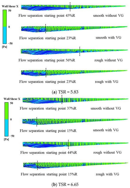 To capture the flow state of the suction surface, the distribution of streamwise wall shear on the suction surface is extracted as shown in Figure 22. A positive value of wall shear X means that the surface flow direction is consistent with the incoming flow, from the leading edge to the trailing edge. In this state, the flow of the boundary layer is completely attached to the wall. A negative value of wall shear X means that the surface flow direction is opposite to the incoming flow, from the trailing edge to the leading edge. In this state, the flow of the boundary layer is no longer attached to the wall, and forms a flow separation vortex. Large areas of flow separation appear on the suction surfaces of the blade without VG at both wall conditions. The flow separation area at the rough wall condition is larger than at the smooth wall condition. Because the stall AOA of the airfoil is advanced at the rough wall condition. Under the same condition, airfoils are more likely to have flow separation of suction surfaces at the rough wall condition. At the same time, the flow separation areas contain strong spanwise flow. This phenomenon is caused by uneven surface pressure of blade elements. The surface pressure difference in the flow separation areas causes the air flow from high pressure to low pressure. VG effectively inhibits the flow separation of the suction surface and the surface spanwise flow. This is similar to the results of the Seel et al. [30]. At TSR = 5.83, the flow separation staring point decreased from 45% R to 23% R in the smooth wall condition and from 56% R to 23% R in the rough wall condition. Between 15% R and 23% R, VG is unable to form an effective vortex structure to control the flow due to the large local AOA. At TSR = 6.65, the flow separation areas decrease from 37% R to 15% R in the smooth wall condition and from 44% R to 15% R in the rough wall condition. There is no flow separation on the surface in the area where the VGs are installed (15% R ~ 56% R).
