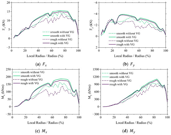 Figure 23 shows the aerodynamic force experienced by each blade element in the spanwise distribution of the blade at TSR = 5.83. The loads with VG are greater than without VG in both wall conditions in the areas where VG inhibits flow separation (23% R~56% R). At the same time, the loads with VG are also greater than those without VG in some areas where VG is not installed (56% R~90% R). The increase of is reflected in the increase of in the aerodynamic performance of the blade. Similarly, the increase of is manifested as the increase of . However, the increase is relatively small, leading to insignificant changes in . Between 50%~85% R, the load without VG exhibits certain fluctuations, while the load with VG remains stable. This phenomenon is attributed to the instability of the flow state on the suction surface of the blade within this range, as illustrated in Figure 22. With the presence of VG, the span-wise distribution of the flow is weakened, making the flow along the chord direction between 50% R~85% R more stable. Consequently, the aerodynamic force in this part is enhanced. It is noteworthy that both the loads with and without VG are smaller at the rough wall condition. This is because the rough wall not only increases the differential pressure drag by changing the flow state but also directly increases the friction drag of the wall. The loads with VG are quite close under the two wall conditions, indicating that VG improves the roughness insensitivity of the blade, which is crucial for increasing the output power of the blade.