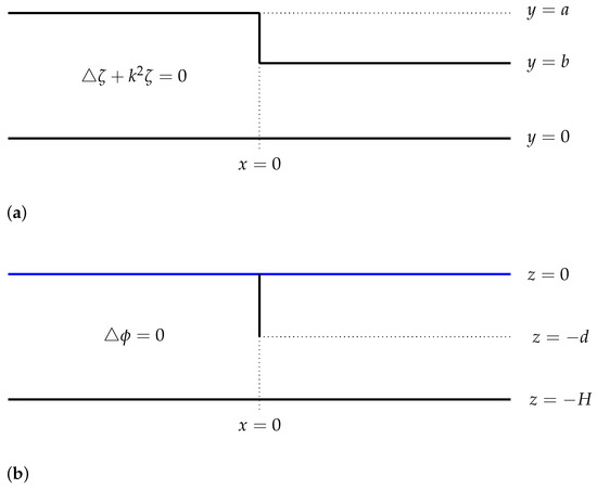 The problem of wave scattering in a parallel-walled channel with a step change in width from a to b, where , is considered. A schematic of the problem is given in Figure 2. This is closely related to the problem of scattering of normally incident plane waves by a periodic array of rectangular blocks considered in [15]. In the problem we consider, the fluid domain is given by , where H is the depth of the fluid. Moreover, , in which