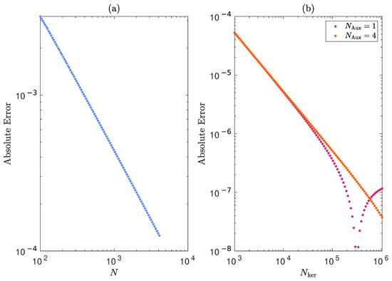 Convergence of (a) the eigenfunction expansion method and (b) singularity-respecting Galerkin approximations for the channel scattering problem, with respect to the respective convergence parameters N and . In panel (b), results are given for both (magenta markers) and (orange markers).