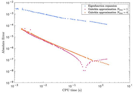 Relationship between the compute time and the absolute error for the eigenfunction expansion (blue dots) and 2-term or 5-term singularity-respecting Galerkin (magenta or orange dots, respectively) solutions to the vertical barrier problem.