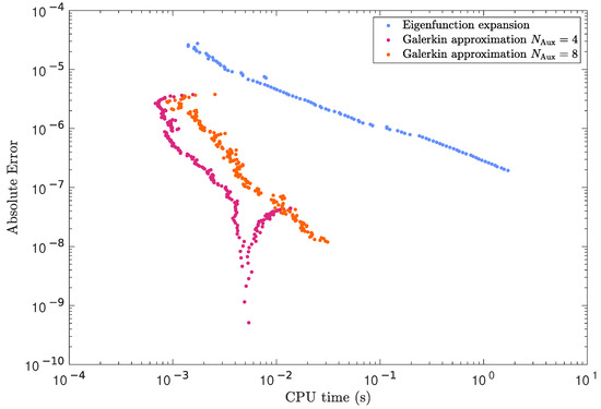 Relationship between the compute time and the absolute error for the eigenfunction expansion (blue dots) and 5-term or 9-term singularity-respecting Galerkin (magenta or orange dots, respectively) solutions to the channel problem.