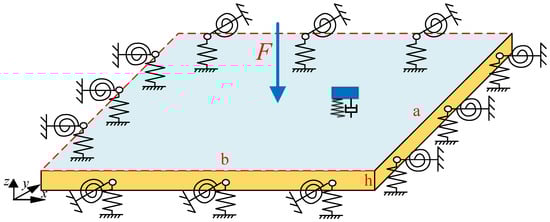 To better describe the system comprising plate and dynamic vibration absorbers subjected to diverse edge conditions, the schematic representation of the aforementioned system is depicted in Figure 2. The main geometric parameters of the plate are as follows: length a, width b, and thickness h. To simulate diverse boundary conditions, artificial springs are placed on four sides of the plate. Translational and rotational are denoted by k and K, respectively. Various boundary conditions can be easily implemented by specifying corresponding stiffness values. Parameters of the dynamic vibration absorber are characterized by mass (), spring (), and damper (). The coordinates of the location of the dynamic vibration absorber are denoted as . The subscript i signifies the sequence number of the dynamic vibration absorber.