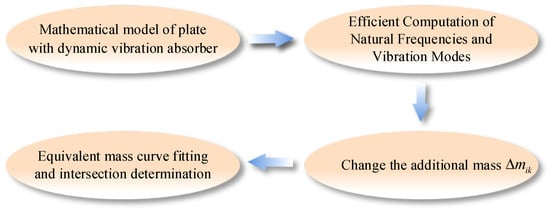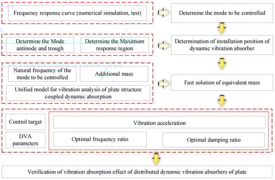 Figure 15 displays the design procedure of the dynamic vibration absorber for the plate structure. First, the vibration characteristics of the plate under various edge conditions are derived through the proposed mathematical model. The point nearby the antinode of the corresponding control mode of the plate is usually chosen as the installation point. Subsequently, the equivalent mass of the installation point can be easily obtained through the current mathematical model. By combining the equivalent mass and optimal homology relationship, the parameters of dynamic vibration absorber are determined.