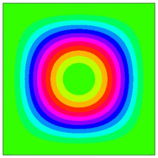 A clamped plate is selected as the research subject. Its dimensions are specified as length a = 5 m, width b = 5 m, and thickness h = 0.025 m. The first vibration mode of the plate is displayed in Figure 6.