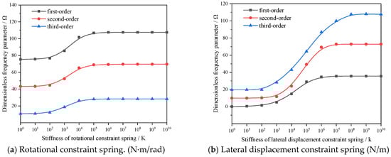 One advantage of the current method is the ease of implementing complex edge conditions by adjusting edge spring stiffness [25]. Therefore, a parametric study of spring stiffness was first investigated in this part [34]. A square plate was selected as the subject of investigation: length a = 1 m, width b = 1 m, and thickness h = 0.002 m. Meanwhile, material parameters were as follows: , , and . When the rotational and lateral spring stiffness values are changed, the first three intrinsic frequency parameters of the plate are as demonstrated in Figure 8. To facilitate a more effective comparison with relevant studies, the frequency parameter was introduced.