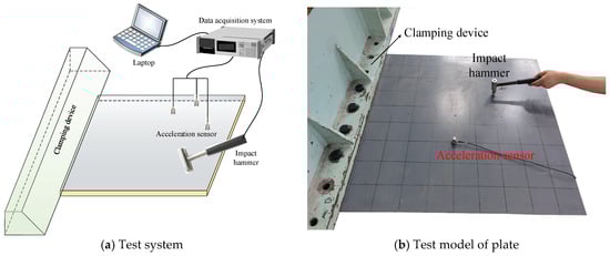 To further validate the current mathematical model, we conducted a modal test on a plate. The dimensional parameters of the test model are as follows: length a = 0.9 m, width b = 0.9 m, and thickness h = 0.004 m. The test system and test plate are illustrated in Figure 9a,b.