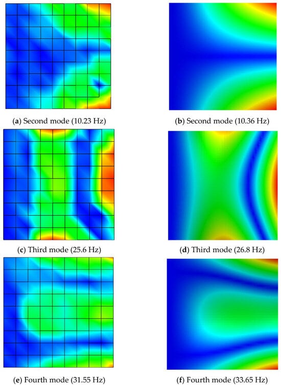 In the equation above, D represents the flexural rigidity of the plate, and w signifies the displacement function of the plate. The parameters ρ and h correspond to the density and thickness of the plate, respectively. The flexural rigidity of the plate can be represented as follows. In Equation (2), E signifies Young’s modulus, and μ represents Poisson’s ratio.
