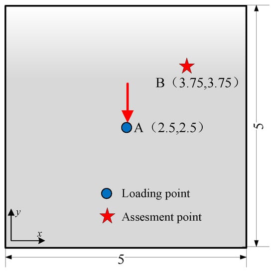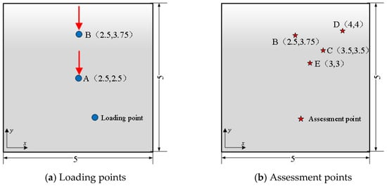 A square plate with length a = 5 m, width b = 5 m, and thickness h = 0.025 m was selected as the research object in this section. When the coordinate origin is defined in the lower left corner of the plate, the locations of the loading points and assessment points are as shown in Figure 16a and Figure 16b, respectively.