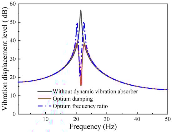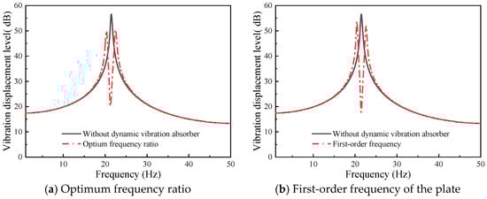 The optimum frequency ratio of 0.91 is obtained using Equation (17). As illustrated in Figure 12, the vibration absorption performance is enhanced at the optimal frequency ratio. Additionally, when the influence of damping of the dynamic vibration absorber is also considered, the vibration response of the plate is as shown in Figure 13.