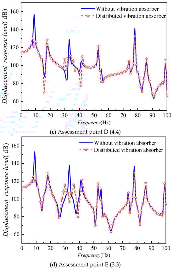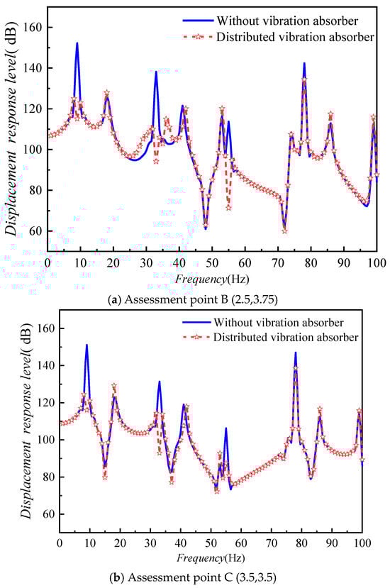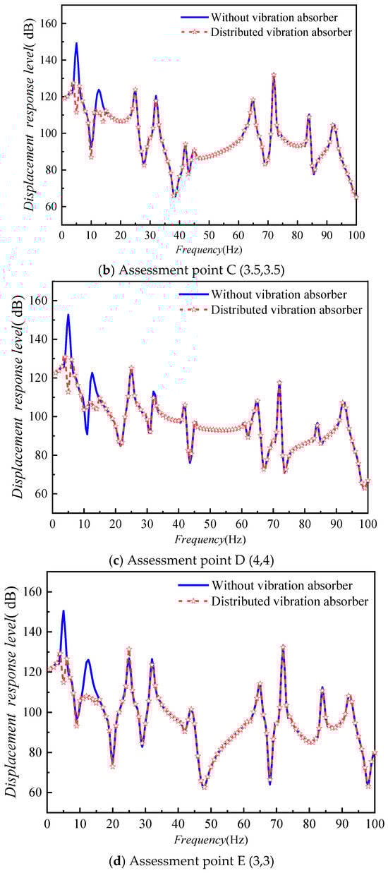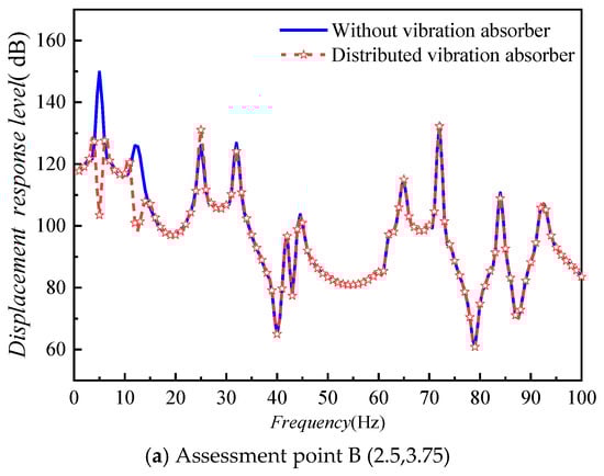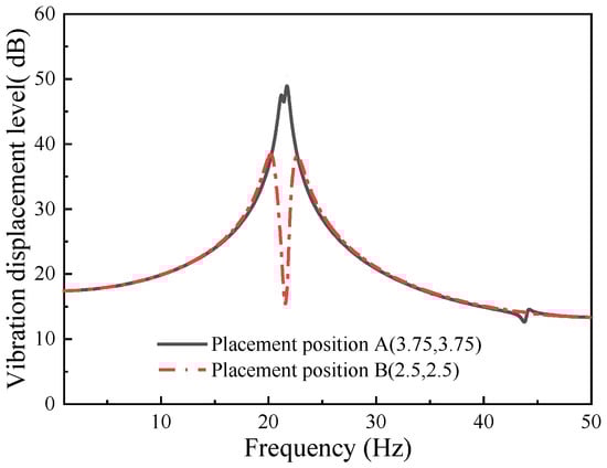 To further investigate the impact of the placement of the dynamic vibration absorber, the installation position is, respectively, set at A (2.5,2.5) and B (3.75,3.75) of the plate. The vibration response at point A (2.5,2.5) of the plate is shown in Figure 14.