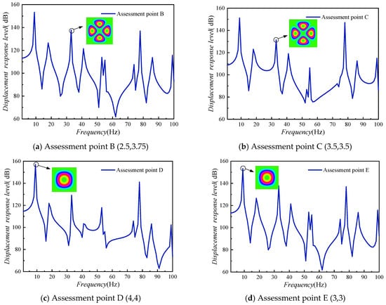 When the four sides of the rectangular plate are rigidly fixed, a force of magnitude 1 N is applied to points A and B, as shown in in Figure 16a. The vibration response of the assessment points are displayed in Figure 17.