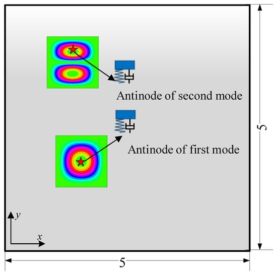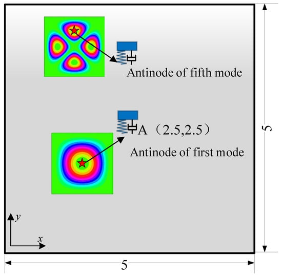, , and represent mass matrix, damping matrix, and stiffness matrix, respectively. represents the vector of external force. The vibration response of the plate equipped with a dynamic vibration absorber, when subjected to excitation, is obtained by solving Equation (13) and inserting the pertinent coefficients into the plate’s displacement function.