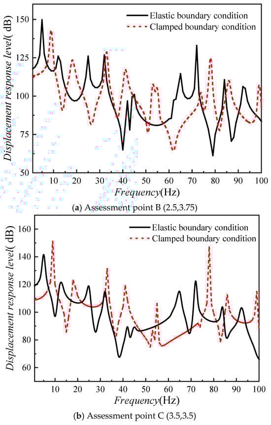 It is easy to find that the first-order and second-order peaks are well controlled, as shown in Figure 22. Among the four assessment points, the first-order resonance peak is reduced by more than 21.4 dB, and the second-order resonance peak is reduced by more than 15 dB. The mathematical model and design approach remain effective under elastic edge constraint.
