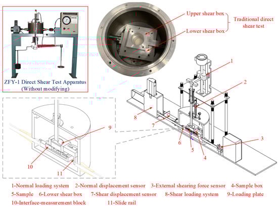 The direct shear instrument with a simple internal structure, a significant transformation space, and the manufacturing, saturation, and installation process of clayey and sandy soil samples are relatively convenient and easy. And many interface shear test studies are based on displacement-controlled direct shear tests to evaluate the interfacial strength (including peak and residual strength). The test results are very representative and can be compared with the test results of this study, which will be presented in the following. Thus, this paper upgraded and modified the traditional direct shear instrument ZFY-1 (Figure 2) using a steel block with an internal sensor to replace the lower shear box to accurately obtain the soil-structure interface strength (see Section 3 for details). We refer to the improved testing system as the MIDST apparatus, as shown in Figure 2. It consists of four primary systems: normal loading system, shear loading system, interface-measurement block, and data acquisition and control system. The normal loading system mainly comprises a normal load actuator to apply the normal stress on the top of the sample. A normal displacement sensor monitors the normal shear deformation during shearing. The sample diameter is 61.8mm, and the height is 20 mm. The upper surface of the friction block is 20 mm by 20 mm. The shear loading system permits shear rates ranging from 0.002 mm/min to 4.5 mm/min.