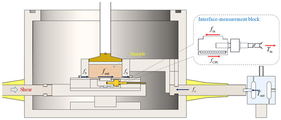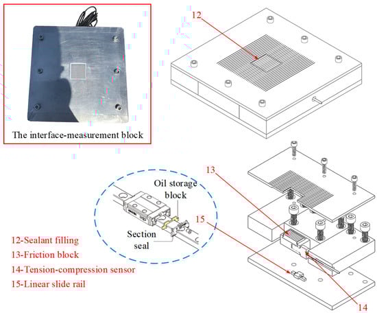 The interface-measurement block consists of a friction block with an internal shear load sensor, an internal slide rail, and a frame (Figure 3). The whole structure consists of the top plate, middle frame, and bottom plate. The interface-measurement block is 130 mm in length by 130 mm in width by 25 mm in height, which is placed inside and fits precisely with the lower shear box. The upper surface roughness of the friction block and the top plate is identical. The tension-compression sensor connects the friction block to the sidewall of the middle frame structure, adopting the methods of loading and unloading in steps to calibrate the sensor’s sensitivity assembled in the interface-measurement block. The weights are loaded in 3 steps and unloaded in 3 steps. The sensitivity assigned to the whole interface-measurement block is 65.27 N/V.