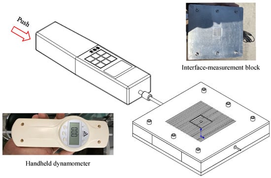 An MR micro linear slide rail, CPC MRU3MN SU from Taiwan, is arranged between the friction block and the bottom plate. According to the manufacturer’s laboratory test results, for a single slide rail without any structural design, the friction between the seal plate at the bottom of the slider and the track is 0.1 N, and the sliding friction coefficient between the slider ball and the trail is 0.002~0.003. The friction of the CPC linear slide rail is minimal and negligible, as demonstrated by a simple test. We use a handheld dynamometer to push the side centre of the friction block through a reserved hole and measure the linear slide rail’s resistance after assembly (Figure 4). The dynamometer reading f1 and the inner tension-pressure sensor reading f2 are recorded under normal forces of 0, 25, and 50 N, respectively. Table 1 shows the test results, the interface-measurement block friction is the linear slide rail friction, responding to the difference f1–f2 between the two sensors. From the experimental results, the friction of the slide rail after assembly is larger than the calibration results of the manufacturer’s laboratory. The friction of a single-section seal after assembly is 0.13 N, and the friction coefficient is about 0.0026. And this minor friction increment can be ignored relative to the shear force on the soil-structure interface.
