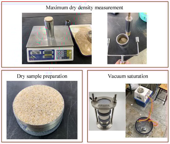 The samples use the dry sample preparation method to achieve the target sample density. A given mass of dry sand is filled into three layers in the cutting ring and compacted by the light compaction method to achieve a uniform density in the model. The height of the specimen is 20 mm, with a density of 1.83 g/cm3. The samples are finally placed in the vacuum saturator for saturation, as shown in Figure 5.