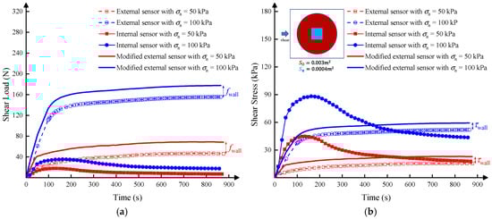 Figure 6 exhibits the shear behaviour of the soil-structure interface shear tests under different levels of normal stress. The typical shear load–time curves are shown in Figure 6a. It can be observed that the soil-structure interface shear load increases with the normal stress increase. The main reason is that the normal stress applied to the interface increases the friction resistance between the soil particles and the steel or the soil particles themselves, increasing the shear zone’s peak strength. It is worth noting that when analyzing the interface shear strength, we found that the interface strength measured by the internal sensor in the interface-measurement block is more significant than that measured by the external sensor. The results measured by the external sensor are hardening curves, while those measured by the internal sensor are softening curves, showing apparent inconsistency. The following will analyze and discuss the above conjecture and test results in combination with the characteristics of the direct shear test and relevant references to demonstrate the reliability of the test method proposed in this paper.