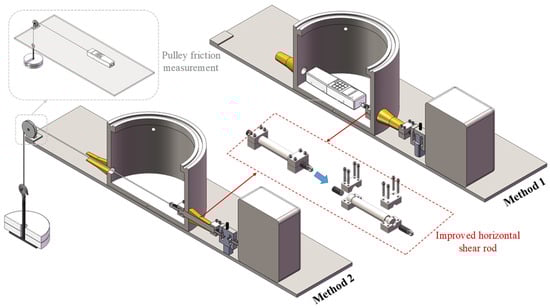 The friction between the horizontal shear rod and the sidewall of the water bath fr mainly affects the accuracy of the traditional test method with an external sensor. In other words, if we use the counting of the external sensor as the shearing force of the interface, we will underestimate the shear strength of the soil-structure interface (fout > Tout). Therefore, it is necessary to calibrate the direct shear test system friction and correct the measurement results of the traditional soil-structure interface shear test. We measure the friction of the direct shear test system in two ways: (i) pushing with a handheld dynamometer or (ii) loading with a pulley. An improved horizontal shear rod is employed in this test, as shown in Figure 8. The friction of the pulley, fpulley, is measured through the three groups of tests, and the average of test results is 9.72 N as the fpulley.