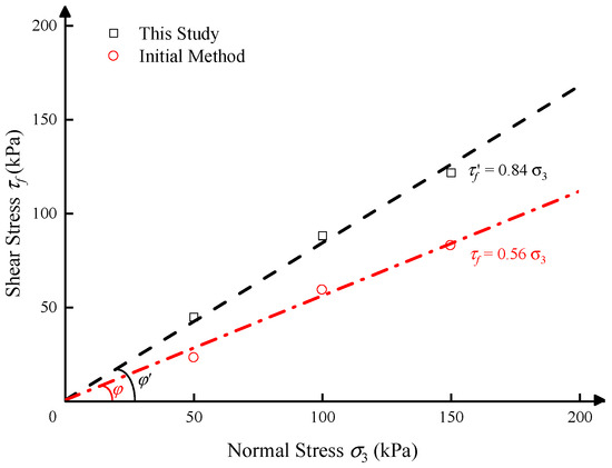As we all know, scholars usually use the Mohr-Coulomb criterion to characterize the mechanical properties of the soils, such as Equation (3). The peak strength and its corresponding normal stress for each set of tests are recorded in Figure 9. And the circle points are the test and analysis result of the external sensor, which corresponds to the test result of the traditional test method; the rectangle points are the test and analysis result of the internal sensor, which corresponds to the test result of the improved test method mentioned in this paper.