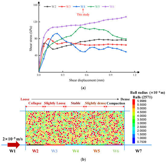From Figure 11, we can see that the shear stress curves vary across different sections. The shear stress increases gradually from left to right: the shear stress in the left area (W2) is the least and reaches its maximum in the right section (W6), while the inner cells (W3~W5) are similar. A fascinating phenomenon is that the shear band above W3~W5 gradually thickens first and then thins, with the thickest shear band presents above W4. The main reason for this phenomenon is that the boundary effect on the two sides simultaneously affects the soil particles. During the shearing process, the soil particles above the W5, on the shear band, move along the shear direction, forming a dense area. This particle flow law leads more soil particles to engage in anti-sliding, so the shear resistance is much higher than the average level and exhibits a hardening curve. But for the soil particles above the W6, except for the soil particles on the shear band moving along the shear direction, the remaining soil particles tumbled slightly upward along the shear direction due to the constraining of the boundary conditions, resulting in a decrease in the normal stress and exhibiting a softening curve. Meanwhile, the soil particles above the W2 and W3 areas collapse downward during the shearing process, forming a loose scope. With the increase of shear displacement, the number of collapsed particles varies across different sections, and the shear resistance weakening degree varies. Due to the strong boundary effect, the failure of the soil-structure interaction occurs on the contact surface, and the thickness of the shear band is approximately zero (W2). The area near the centre of the contact surface (W3 and W5) is less affected by the boundary effect (loose or squeeze) than the boundary area (W2 and W6), and there are evident disparities. For the W4 part at the centre of the sample, the failure gradually extends into the soil, and the shear band grows thicker. It means that more soil particles are disturbed in this area, and the contact area of the soil particle will increase, resulting in higher shear resistance. And with the shearing displacement increase, the particle movement gradually becomes stable, decreasing the shear stress and forming a softening curve.