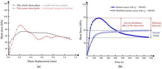 From Figure 6b, we can find that although the test results of the external sensor have been corrected with the interface shear system friction, the peak shear strength of the tests of the internal sensor is still greater than those of the external sensor. And the residual strength measured by the internal sensor is less than the test results of the external sensor. There is only one reason to explain this problem: the shear stress distribution in the shear zone is uneven. The shear stress at the centre of the contact surface is greater than the average shear stress of the whole contact surface.