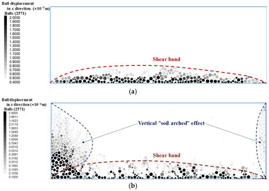 DEM results show that, in addition to the obvious shear band on the contact surface (Figure 13a), two vertical shear bands are near the sample box’s sidewalls (Figure 13b), exhibiting a vertical “soil arched” effect. The boundary constraints mainly cause their formation, and the sample is divided into four parts based on the particle’s movement direction (Figure 13c). For the left part, the soil particles collapse, and soil particles in the right area roll up. The particles in the bottom part move in a shear direction, and the upper particles move in the opposite direction. This phenomenon illustrates that except for the relative displacement of the soil-structure, there is also soil deformation during shearing. It is consistent with the conclusion of Yin et al. [10], which proves the rationality of the DEM verification method in this paper.