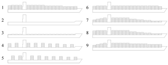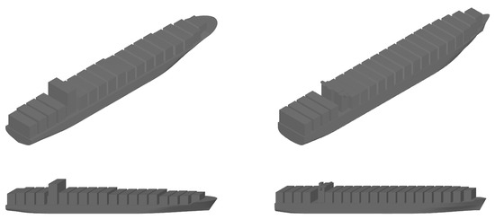 In this study, the numerical simulations were conducted for a post-Panamax 6750 TEU containership [27] and a 9000+ TEU containership [3]. Further, 3D models of the fully loaded 6750 TEU and 9000+ TEU containerships are presented in Figure 1, while the main particulars are listed in Table 1.