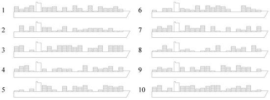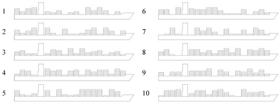 The dataset for the training of the ML models consists of wind load coefficients obtained in [12] for the container configurations shown in Figure 2 and Figure 3. To expand the dataset, additional numerical simulations were conducted for ten random container configurations, as shown in Figure 4 and Figure 5.