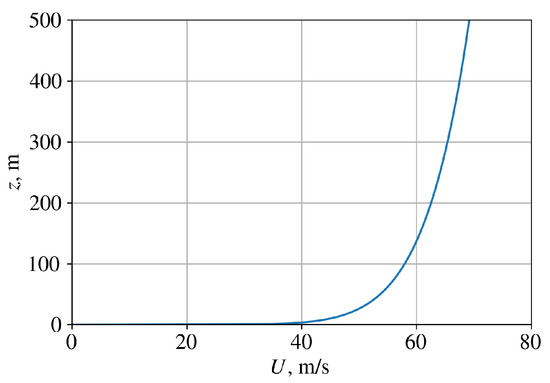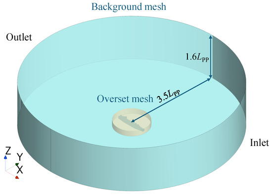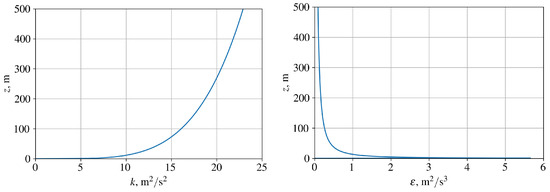 The numerical simulations were performed using the same grid configurations and numerical setup as implemented by Grlj et al. [12]. The computational domain is a cylinder-shaped tank containing an embedded overset mesh that can rotate around the z-axis, as shown in Figure 6. This setup enables the analysis of angles of attack ranging from 0° to 180° within a single simulation by adjusting the mesh rotation. The radius of the computational domain is equal to , while the top boundary is placed at from the bottom boundary. A symmetry condition is applied at the top boundary, while a no-slip wall condition is set at the bottom boundary to capture the natural boundary layer that develops as air flows over the sea surface. Also, at the bottom boundary, the roughness is set with the modified logarithmic law wall function as defined by Blocken et al. [31]. The inlet boundary is set as velocity inlet and the outlet boundary as the pressure outlet. At the inlet boundary, a wind velocity profile is imposed as shown in Figure 7. The turbulent kinetic energy and dissipation rate set at the inlet boundary are shown in Figure 8. For the calculation of the wind profile, the reference velocity is equal to 45 m/s at the height of 10 m.
