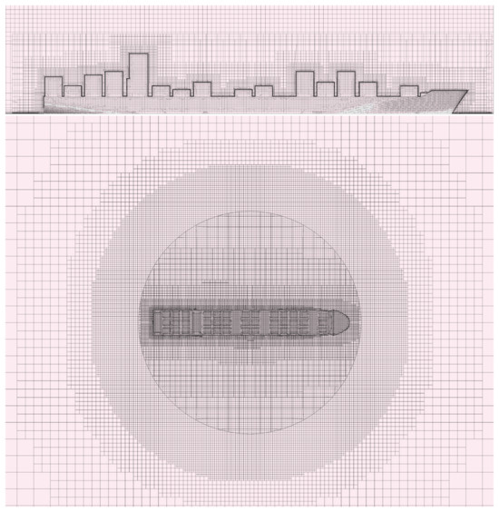 The non-dimensional wall distance at the hull surface is maintained above 30 to enable the use of wall functions [32]. This was achieved by refining the mesh around the hull with prism layers, as shown in Figure 9. Additionally, the prism layers are generated from the bottom surface of the computational domain up to the base mesh to capture the wind velocity profile, as shown in Figure 10. Since Grlj et al. [12] previously quantified the uncertainties related to grid size and time step, a verification study is omitted in this study.