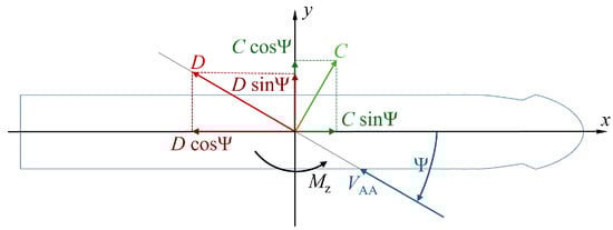 where D and C are the tangential and normal components of the aerodynamic force acting on the ship, respectively, and is the angle of attack, as shown in Figure 11.