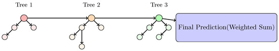 During training, each new tree added to the ensemble attempts to minimize the residual error from the previous trees. Specifically, the gradient of the loss function concerning the current prediction is used to define the residuals that guide the formation of the next tree. This iterative improvement can be represented as [43]