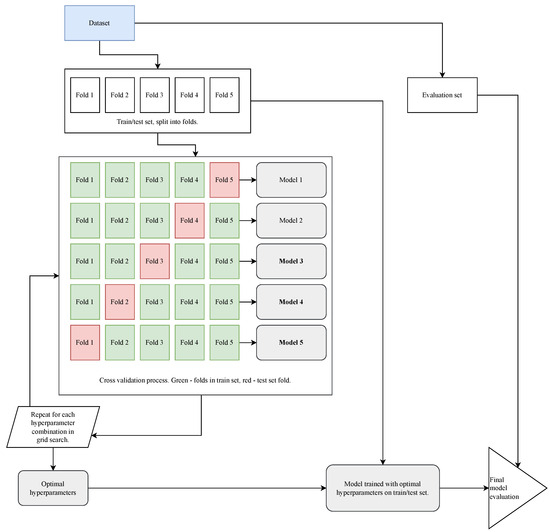 The above process is illustrated in Figure 14. As shown, the original dataset is split. Then, cross-validation process is repeated for each fold and each hyperparameter combination. Once the process is complete and the optimal hyperparameters are identified, the model is trained with the optimal hyperparameters and tested on the evaluation set.