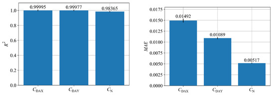 The of the best-performing GBT model targeting is 0.99999, with a standard deviation of 0.00902, while is 0.00553, with a standard deviation of 0.00005. In the case of , the of the best-performing model is 0.9994, with a standard deviation of 0.00708, and is 0.00554, with a standard deviation of 0.00005. Finally, the model for achieves an of 0.99983, with a standard deviation of 0.00915, and an of 0.00111, with a standard deviation of 0.00002. The obtained evaluation metrics are visualized in Figure 16.