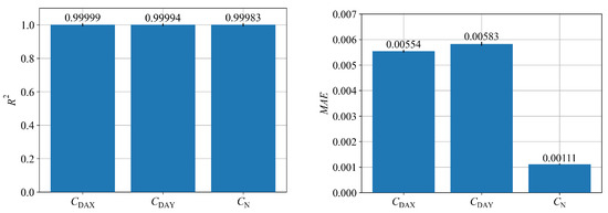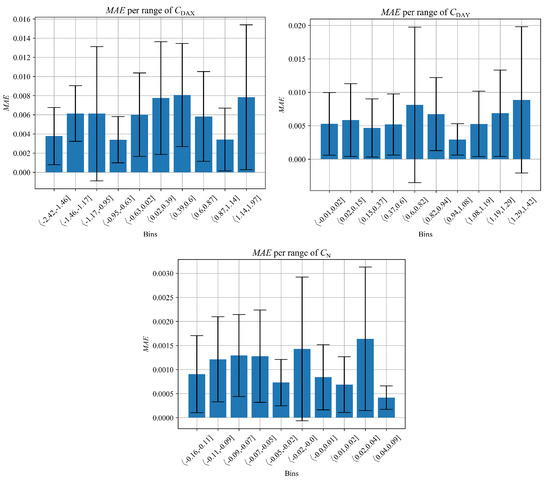 The and obtained with the best-performing MLP model for each wind load coefficient are provided in Figure 15. The of the model targeting is equal to 0.9995, with a standard deviation of 0.01012. The average of that model across folds is 0.01492, with a standard deviation of 0.00042. The of the model targeting is equal to 0.99977, with a standard deviation of 0.00821, while the is equal to 0.01089, with a standard deviation of 0.00023. Finally, the of the model for amounts to 0.98365, with a standard deviation of 0.00761, while amounts to 0.00517, with a standard deviation of 0.00011.