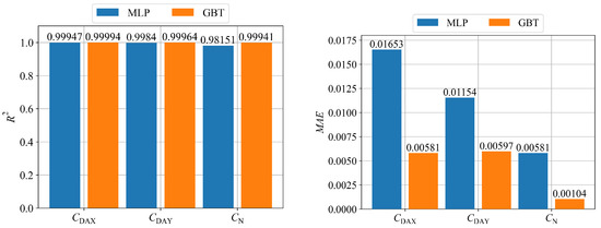 Larger differences are apparent when observing , as provided in Figure 17. For , the GBT model shows an error of 0.00581, compared to a much larger error of 0.01653 achieved with the MLP model. The same is apparent for , where the obtained with the GBT model is equal to 0.00597 and with the MLP model equal to 0.01154. Finally, in the case of , the obtained by the GBT model is equal to 0.00104, which is significantly lower than the value obtained with the MLP model, amounting to 0.00581.
