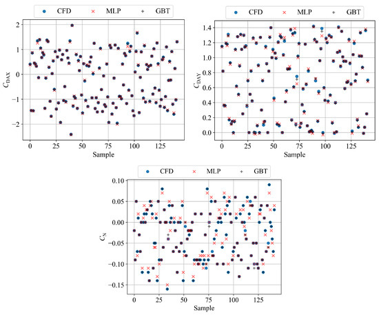 A comparison of both evaluation metrics reveals that the GBT model demonstrates marginally superior performance when evaluated using and significantly better performance when assessed with . This is further confirmed by the predictions observed in the scatter diagrams presented in Figure 18 for each wind load coefficient. The entire test set is presented as the specific predicted values for both methods are not the primary focus. The graph can be interpreted similarly to a predicted-observed graph, with the key difference being that the predictions are provided as discrete rather than continuous values. The scatter between the data obtained with CFD and the data obtained with the MLP model is more pronounced for in comparison to and . The lower error exhibited by the GBT compared to the MLP model suggests that the data may have varying statistical distributions across different sections. In this case, an ensemble model like GBT may perform better because its sub-models can target different sections of the dataset effectively. Both methods exhibit similar variance across the data points (e.g., slightly higher density of near the top and bottom of the evaluated value range, lower density of around 0, and clusters of equal values for ). This explains the high scores for both models. However, the MLP model shows greater differences at individual data points. These differences are particularly evident for , while the other two outputs perform better, with the errors being slightly more pronounced for compared to in the case of the MLP model.