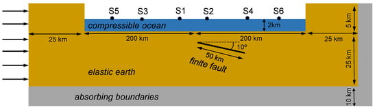 Schematic illustration of the two-dimensional tsunami generation model in ADINA. Six stations on the free surface are as follows: (1) two stations located 5 km to the left and right side of the fault’s upper corner, namely S1 and S2; (2) two stations located 70 km to the left and right side of the fault’s upper corner, namely S3 and S4; and (3) two stations located 120 km to the left and right side of the fault’s upper corner, namely S5 and S6.