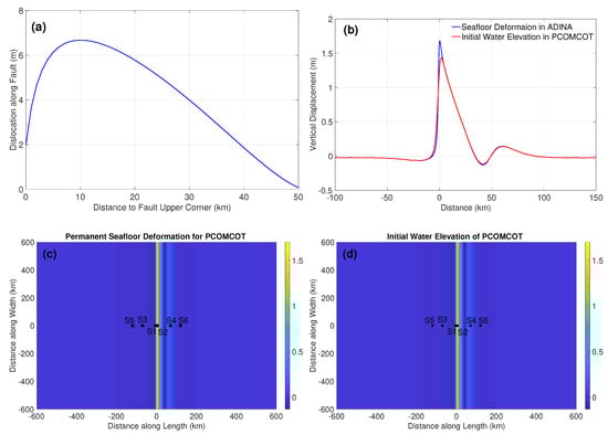 (a) Dislocation along the fault. (b) The permanent seafloor deformation of the ADINA model and the cross-section of the initial water elevation in PCOMCOT. (c) The permanent seafloor deformation used for the PCOMCOT model. (d) The initial water elevation in PCOMCOT.
