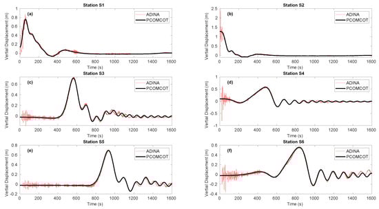Comparison of vertical displacement at six stations on the free surface simulated using the ADINA model and the PCOMCOT model. The red and black lines represent the displacement simulated using the ADINA model and the PCOMCOT model, respectively.