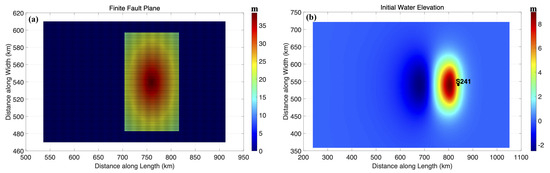 (a) The finite fault plane of an Mw 8.6 earthquake defined in the SPECFEM3D program. (b) The resulting initial water elevation of the Mw 8.6 earthquake. The black dot denotes the station S241 we used for tsunami signal extraction.