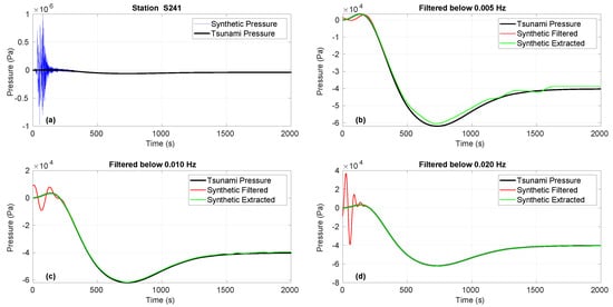(a) The synthetic pressure signal and tsunami pressure signal of the Mw 8.6 earthquake for station S241. (b–d) Comparison of the tsunami pressure, the synthetic filtered pressure, and the synthetic extracted pressure when the cutoff frequency is 0.005 Hz, 0.01 Hz, 0.02 Hz. The blue line represents the synthesis pressure signal. The black, red, and green lines represent the tsunami pressure, the synthetic filtered pressure, and the synthetic extracted pressure, respectively.