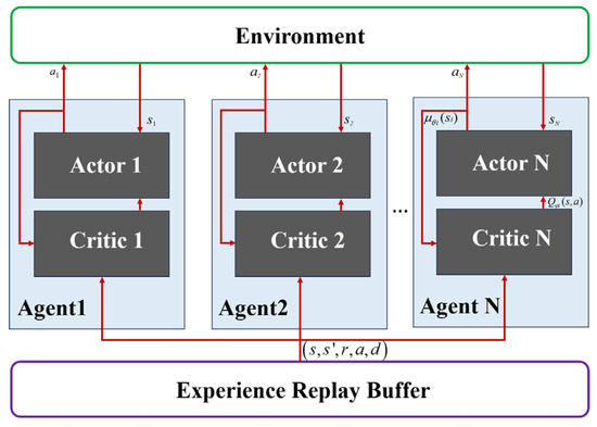 The basic framework of the MADDPG algorithm is shown in Figure 3. During the training process, each agent has its own distributed policy: , , represents the policy, and is a parameterized representation of the policy. Each has a centralized Q-function: , . represents the Q-Function, and is a parameterized representation of the Q-Function. Considering the deterministic policies, the gradient of agent can be calculated as