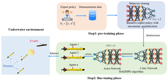 In the MADDPG algorithm, the random initialization of network parameters often necessitates extensive interactions with the environment to learn effective policies. Improper initialization can lead to the algorithm becoming ensnared in local optima or facing difficulties in converging. Moreover, the exploration–exploitation trade-off inherent in reinforcement learning can also result in low sample efficiency. Behavior cloning (BC) can enhance efficiency by emulating optimal policies or demonstrations. While traditional BC is efficient due to its minimal connection to the MDP, it may encounter challenges when agents encounter states not seen during training.