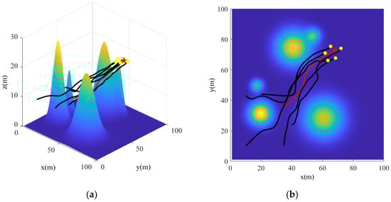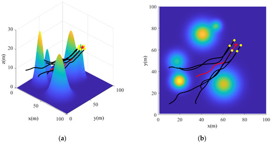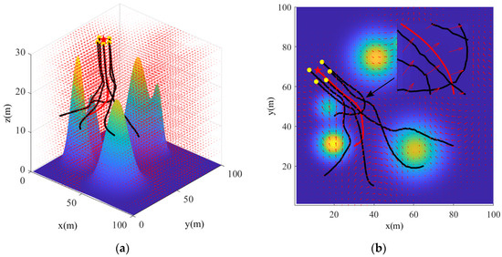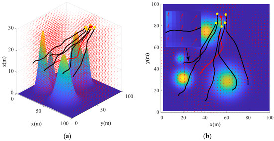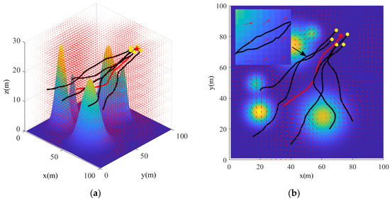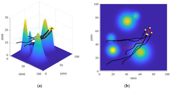 Figure 10b depicts a phase in which the hunters commence movement against the current, resulting in diminished velocity and a protracted final path. In contrast, hunters in both Figure 8b and Figure 9b have learned to utilize ocean currents to reduce energy consumption. In addition, the number of turns of the AUV in Figure 8b is significantly reduced, indicating better performance of our method. From the local enlarged view, it is obvious that the paths in Figure 8b are smoother, indicating that our method has better performance in dynamic environments.
