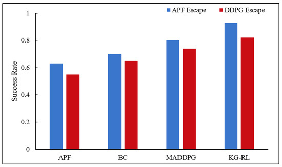 To ascertain the efficacy of our method in cooperative hunting endeavors, a comparative analysis was conducted with the APF-based method, BC, and MADDPG. The APF method’s parameters are configured equivalently to our KG-RL approach. Given that KG-RL is an extension of the traditional MADDPG, both share identical hyperparameters and reward functions throughout the experiments. BC, a quintessential method for learning from demonstration in reinforcement learning, also utilizes the APF method to source demonstrations, matching the quantity of demonstrations provided to KG-RL. For the evaders, two escape strategies are implemented: one leveraging the APF method, and the other employing the DDPG algorithm.