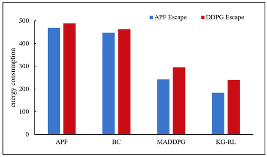 Analysis of the data presented in Figure 12 indicates that the APF-based method is less effective, yielding the lowest success rate among the evaluated methods. BC, despite its shortcomings in learning policies capable of capturing the evader—owing to the suboptimal policy of the APF demonstrations from which it was derived—achieves a slightly higher success rate than APF. MADDPG, while exhibiting a slower learning curve, attains a commendable success rate. This is attributable to the global critic’s capacity for holistic environmental observation and the communication protocol that facilitates information exchange among pursuers. KG-RL notably surpasses both APF and BC in the evaluation, suggesting that the fine-tuning phase enhancements can elevate policy performance, enabling the final policy to transcend the confines of suboptimal antecedents. Notably, the APF method encounters difficulties when contending with the DDPG-based evasive strategy, a challenge exacerbated by the fact that the other three methods were trained against this DDPG strategy, thereby achieving superior outcomes. Figure 13 illustrates that as the policy gradients align with optimal policies, the system’s energy consumption diminishes. The aforementioned evaluation outcomes collectively substantiate that the KG-RL method can markedly augment the efficiency and efficacy of the pursuit policy.