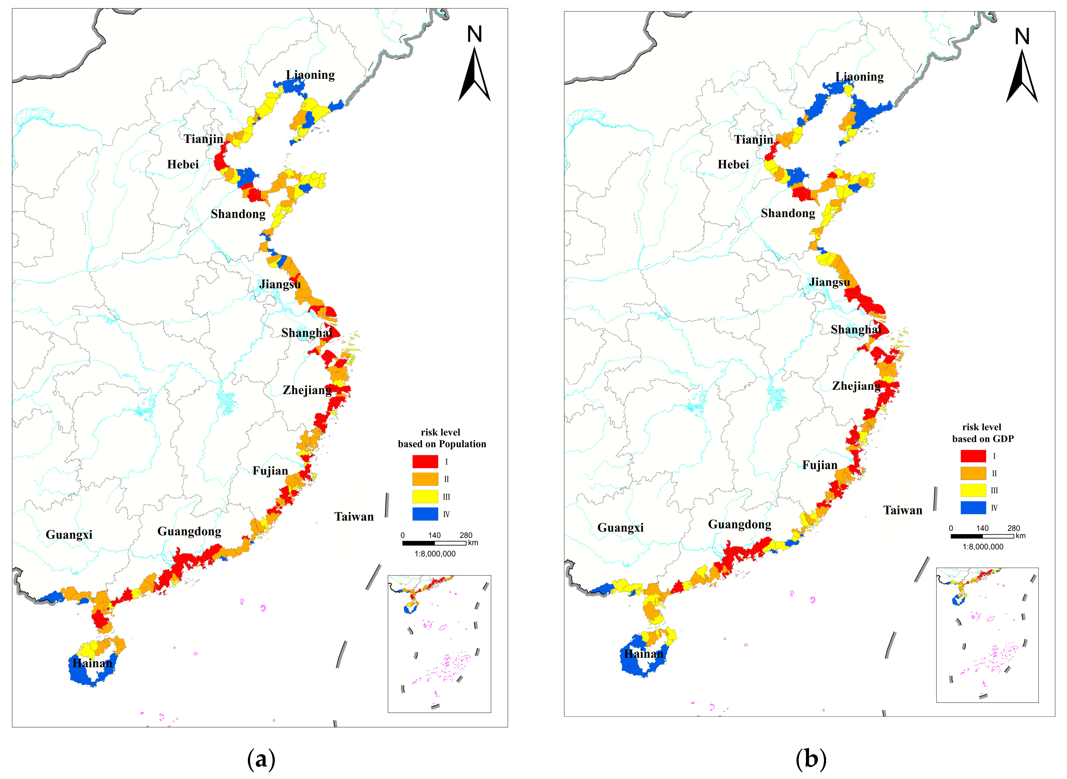 - Fang, J.; Liu, W.; Yang, S.; Brown, S.; Nicholls, R.J.; Hinkel, J.; Shi, X.; Shi, P. Spatial-temporal changes of coastal and Marine Disasters Risks and impacts in Mainland China. Ocean Coast. Manag. 2017, 139, 125–140. [Google Scholar] [CrossRef]